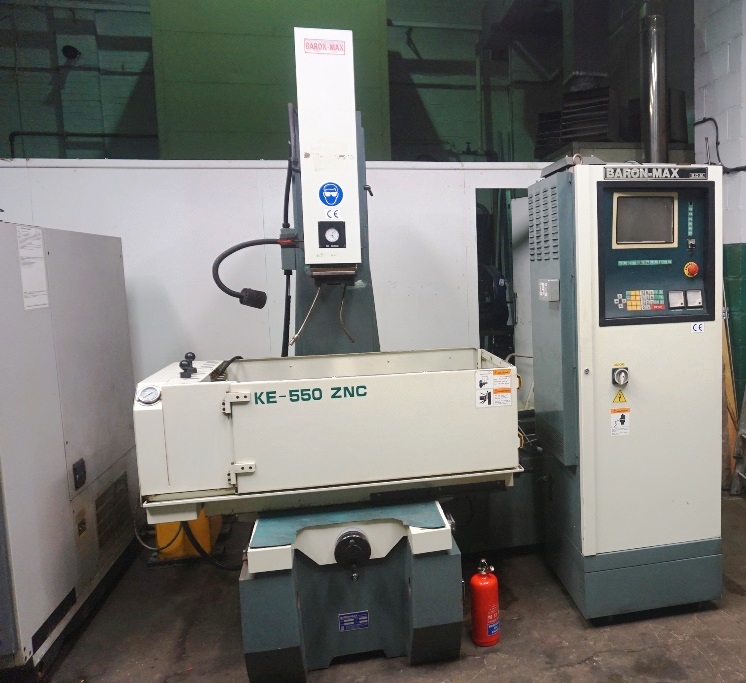 Baron-Max KE-550 ZNC, Manual ZNC EDM Machine, Axis Travel X, Y, Z 550 x 350 x 250mm, Work Table 800mm x 450mm, Work Tank Dimensions 1170mm x 690mm x 425mm, ZNC Control with 3 axis Display, Programmable Z axis with depth Stop Function, 50A Generator, Low Volt Work Lamp. S/No.0699386 (1997)