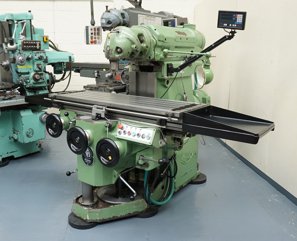Huron NU4 Universal Milling Machine With Powered Overarm. Table Size 1430 x 460mm. Table Travel X 1100mm, Y 700mm, Z 500mm. Spindle Taper 40 ISO. Spindle Speeds 25 -3300rpm. Imperial Dials. Newall Topaz 2 Axis Digital Readout. Lo-Vo Light & Coolant.