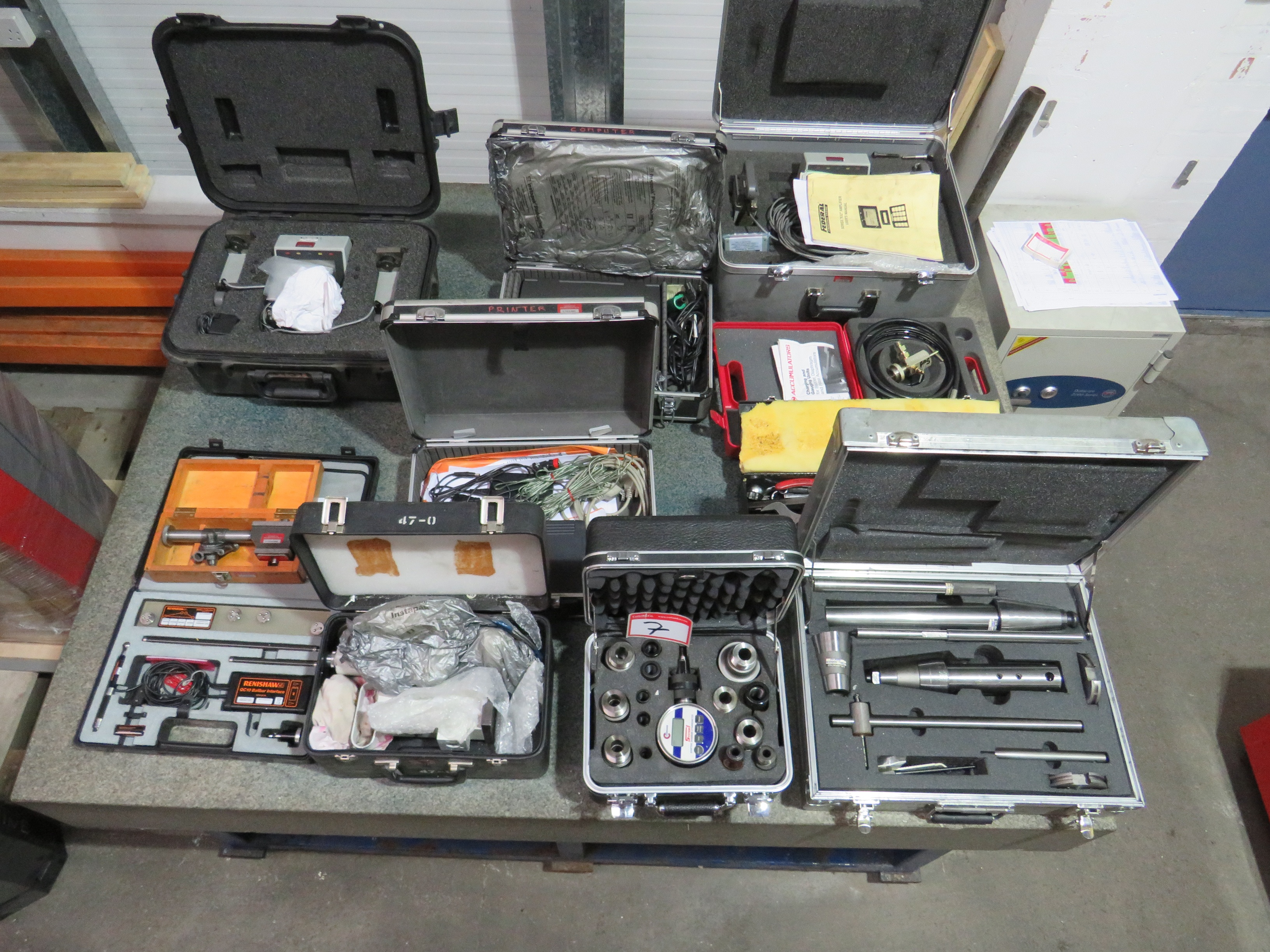 Jobmaster Chest Model 2472 with Federal Levelling Systems, Model 832P-48-W1, Model 832P-50-W1, Computer and Printer, Charging Accumulator, Setting Bars, Command System 11 Adaptive Drawbar Dynometer, Renishaw QC10 Ball Bar Interface, Microscope, Tools
