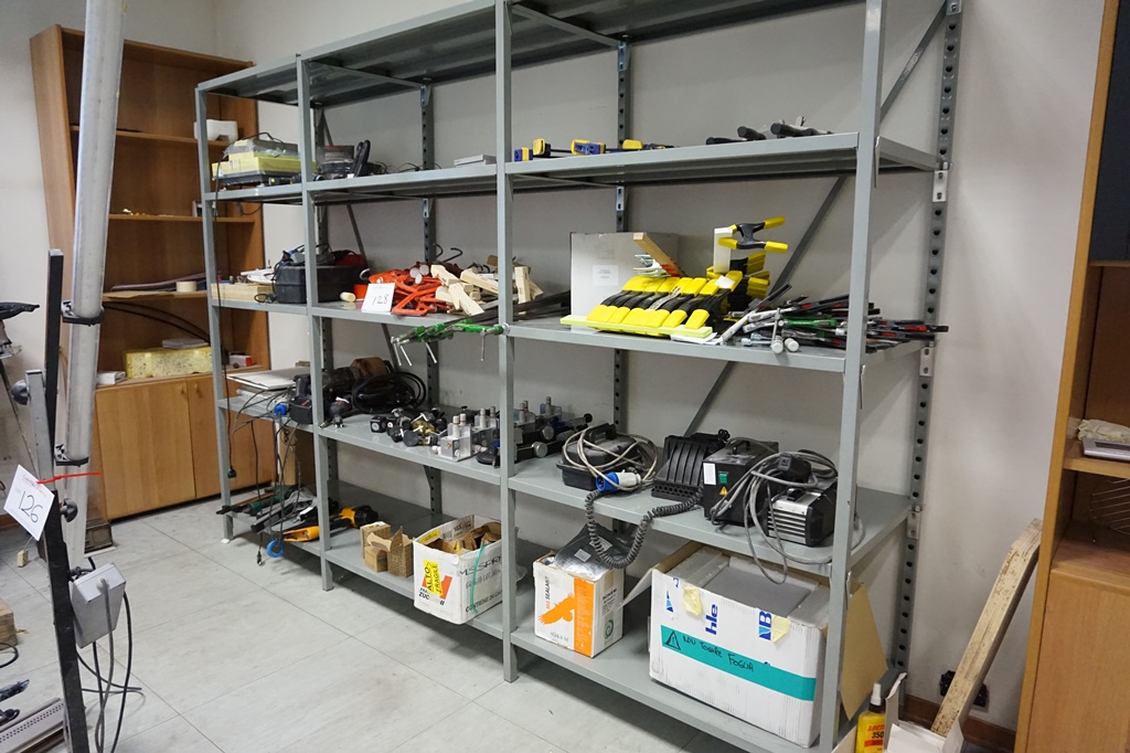 Lotto 128: Rack with Qty Hand Tools, Clamps, Suckers, Staplers, Scales, Laser Infrared Thermometer, Glass Bonding Lamps